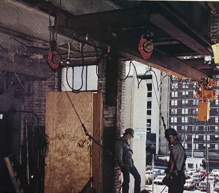 Initially, Central began loading the disassembled presses out of a second-story opening in the building’s south side. Mason, Central’s project manager Bob Verzella and superintendent Art Nelson realized pretty quickly that this procedure was just too slow. After careful evaluation of the flow of the work, they opted to lower the presses through the building using a series of lifts by forklifts on special loadout days. Their productivity increased dramatically. One problem down.